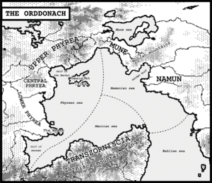 The Orddonach (Phyrean: Or Ddonach, "the coasts") is a large, multi-cultural area uniting the areas surrounding the Namunian, Phyrean and Marcian seas. For this reason, it's also frequently called the Three Seas, from Phyrean Mugell, or Tripontic, a greek calque of the phyrean name.